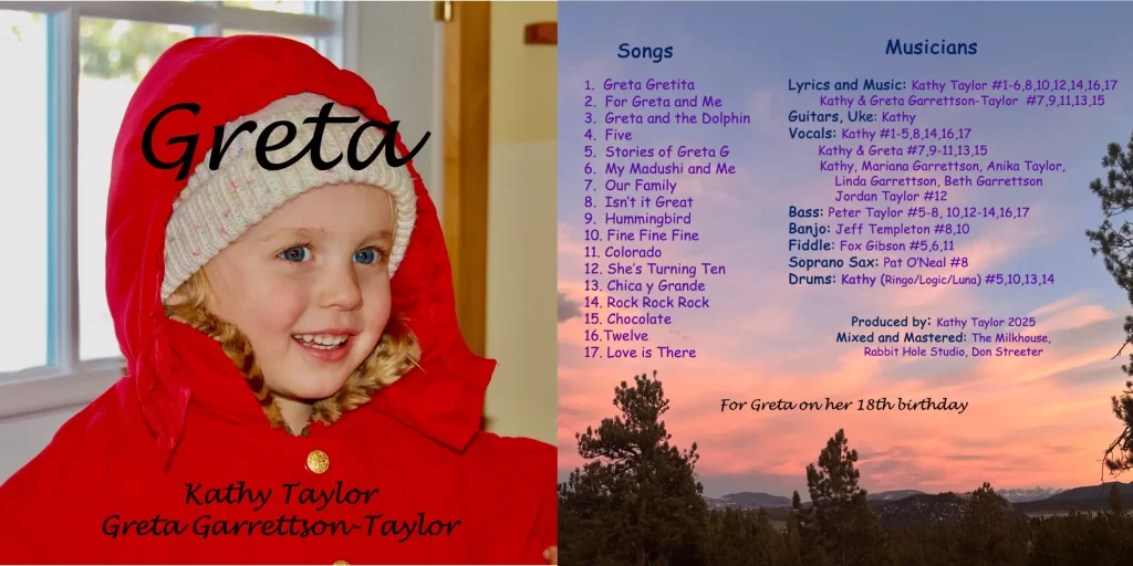 2025 Greta (17 songs) – a CD compilation of original songs in a variety of genres that I wrote for my granddaughter (Greta) each year for her birthday. At age 7, she began to sing on some of the recordings and we began writing songs together. The word “madushi,” means “grandma” in Papiamentu, appears in a couple songs.